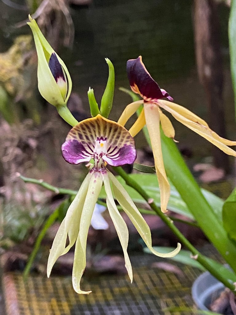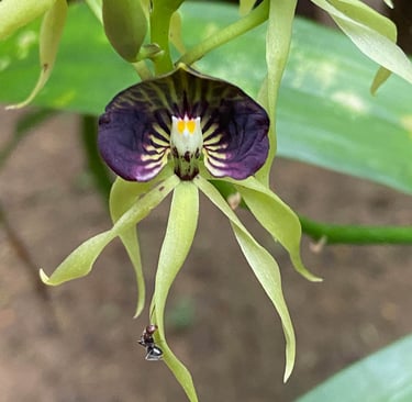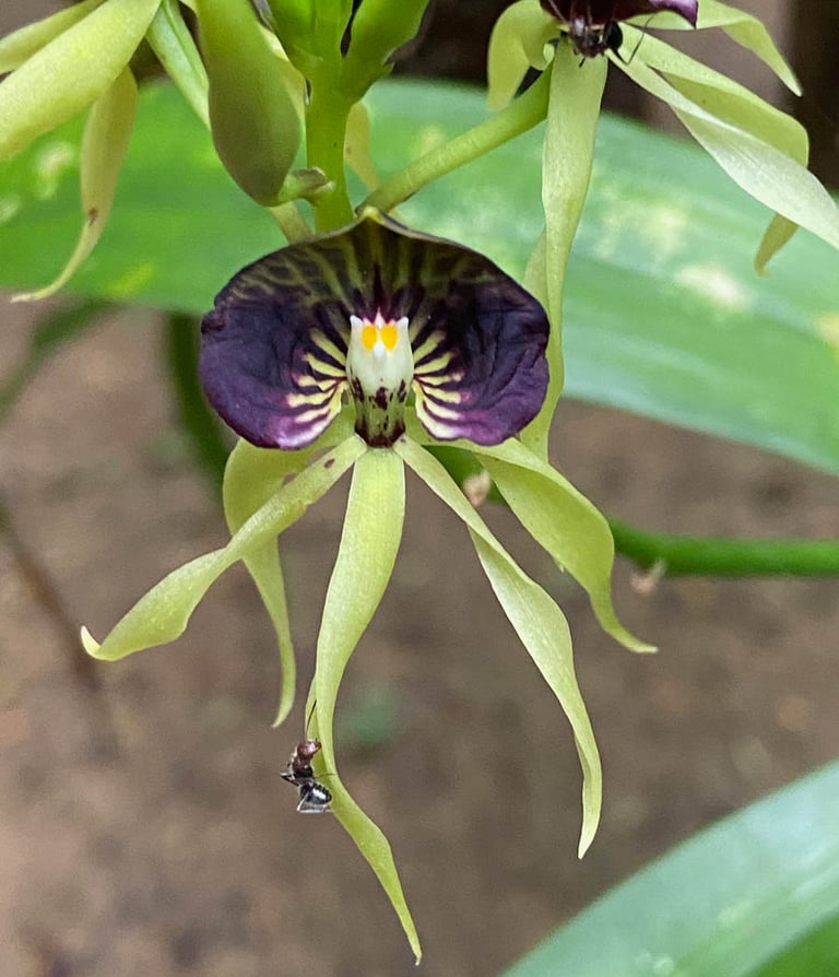 She's extraordinary. Dark, almost purple-black petals fanned upward around a pale, shell-shaped lip. Understated and otherworldly at once. Also known as the cockleshell orchid, she grows epiphytically on trees in damp, shaded spots and flowers for about 6 months, and yet here she was, offered to us like a gift by a man who clearly knew exactly what he had. We stood there for a long moment and didn't say much. Some things don't need words.